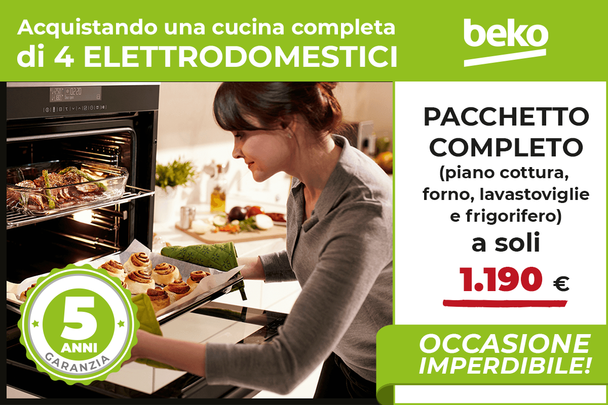 Con una cucina completa potrai acquistare il pacchetto da 4 elettrodomestici BEKO (piano cottura, forno, lavastoviglie e frigorifero) ad un prezzo speciale di soli € 1.190. Inoltre, registrando il tuo acquisto potrai usufruire gratuitamente dell’estensione di garanzia fino a 5 anni.