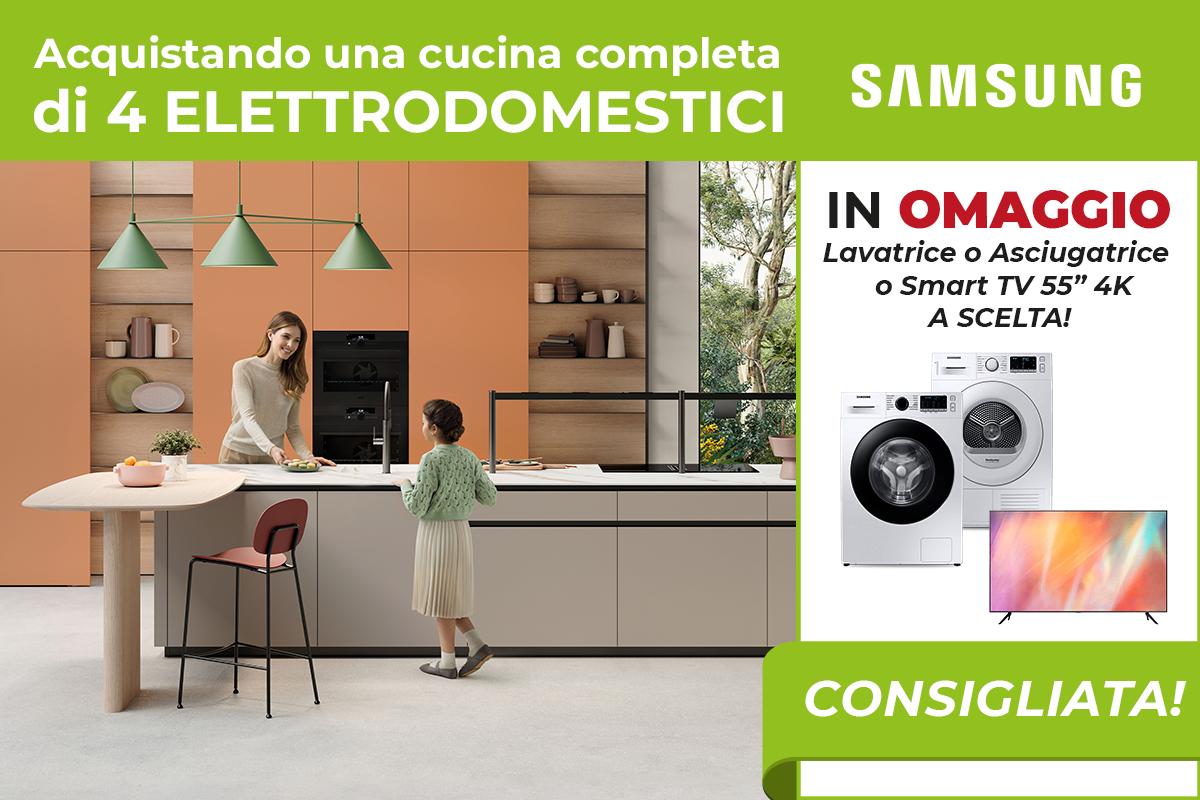 Con una cucina completa di 4 elettrodomestici SAMSUNG (a scelta tra piano cottura, forno, frigorifero, lavastoviglie e microonde) riceverai un omaggio a scelta tra un TV 55” UHD 4K, una lavatrice o un’asciugatrice.