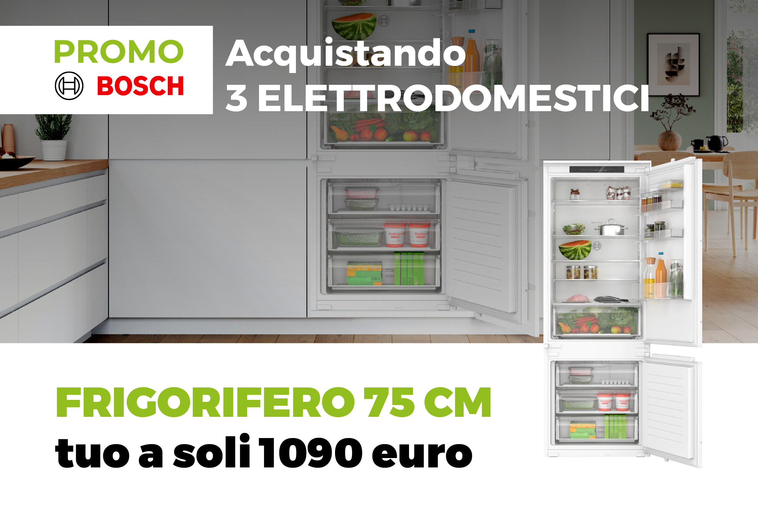 Con una cucina completa di 3 elettrodomestici BOSCH (a scelta tra piano cottura, forno, lavastoviglie e microonde) potrai acquistare il frigorifero No Frost da 75 cm al prezzo speciale di € 1.090 IVA inclusa*.