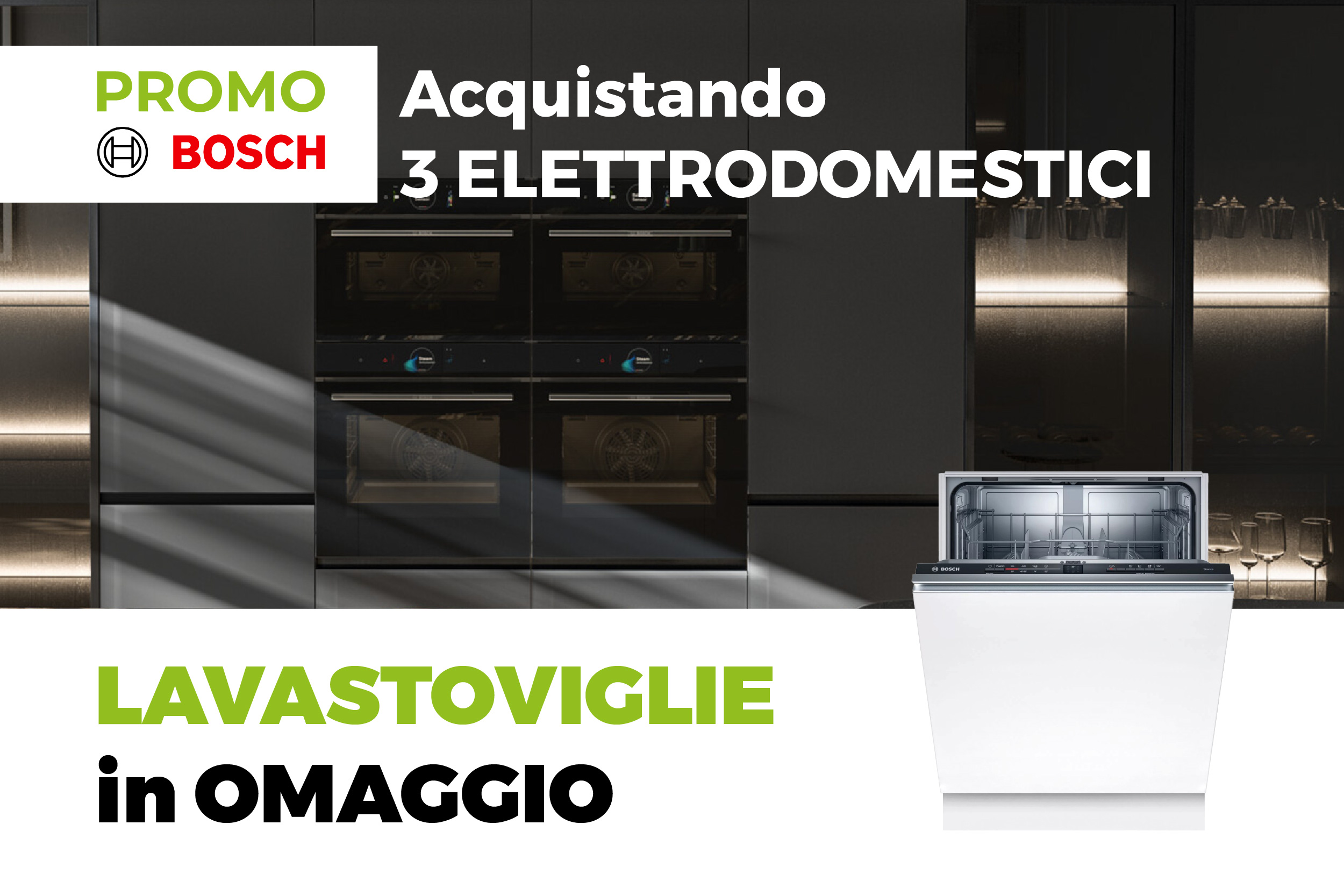 Acquistando una cucina completa di 3 elettrodomestici BOSCH (a scelta tra piano cottura, forno, frigorifero e microonde) riceverai in omaggio la lavastoviglie Mod. SMV25AX06E.