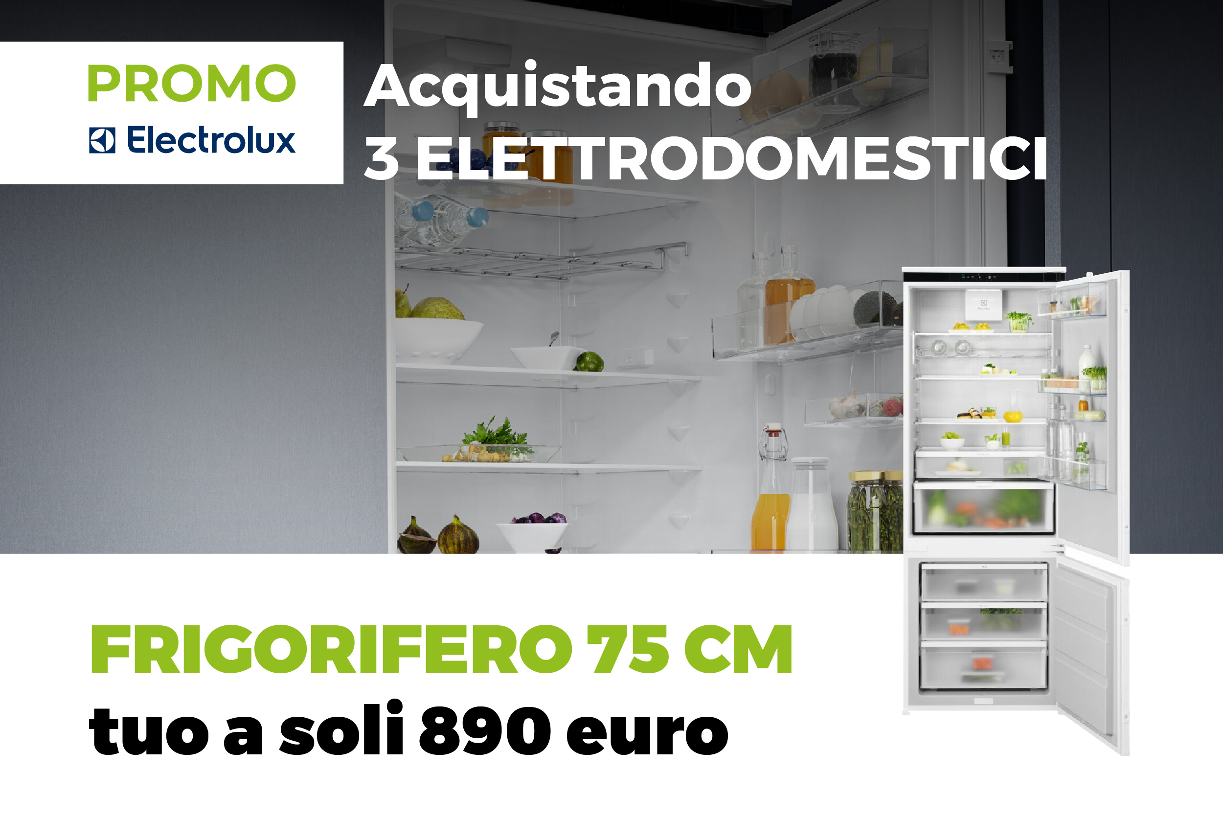 Con una cucina completa di 3 elettrodomestici ELECTROLUX (a scelta tra piano cottura, forno, lavastoviglie e microonde) potrai acquistare il frigorifero Total No Frost da 75 cm (mod. KNR7TE75S) al prezzo speciale di € 890 IVA inclusa.*
