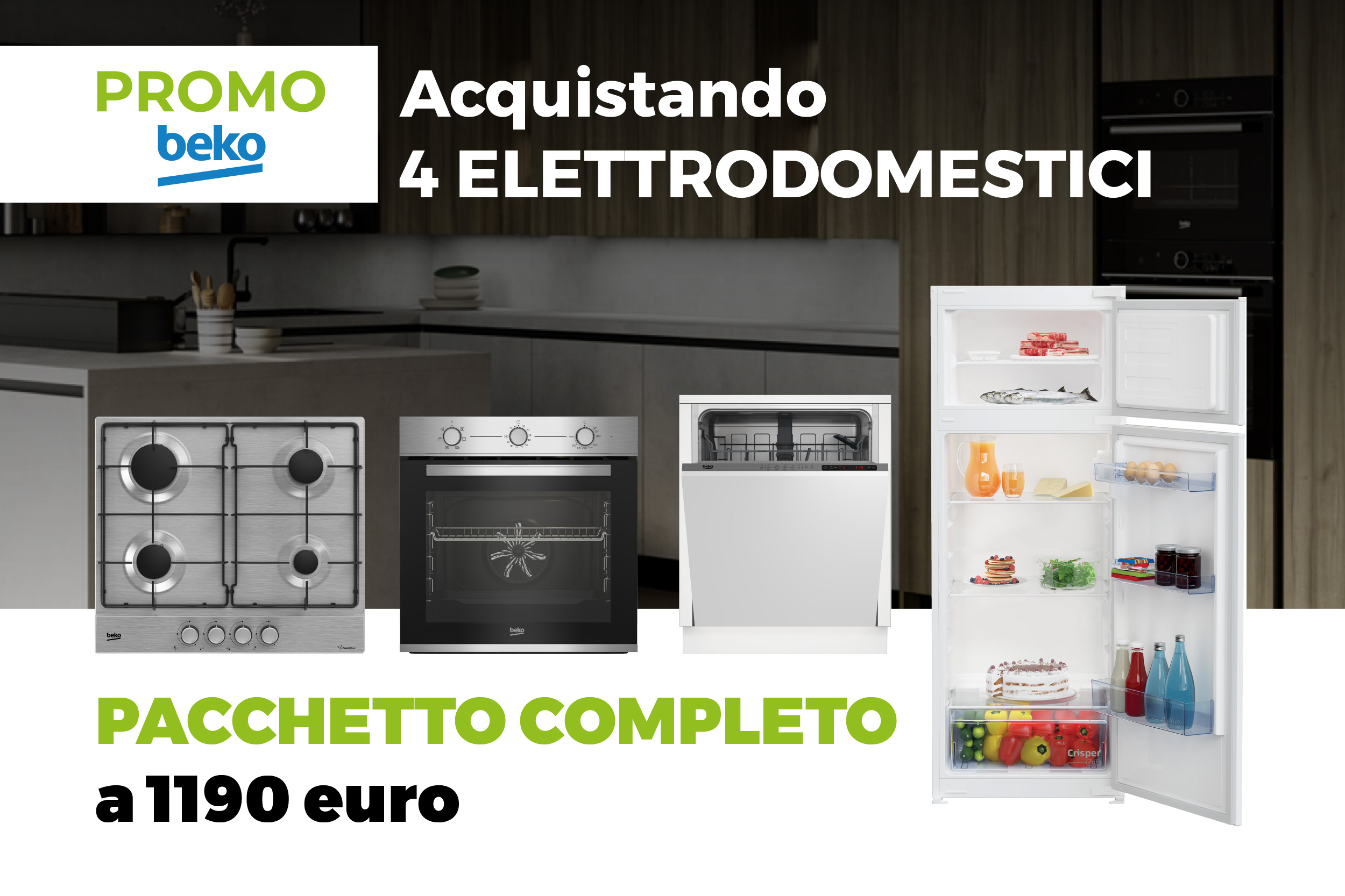 Con una cucina completa potrai acquistare il pacchetto da 4 elettrodomestici BEKO (piano cottura, forno, lavastoviglie e frigorifero) al prezzo speciale di soli € 1.190 IVA inclusa e l’estensione gratuita della garanzia fino a 5 anni*.