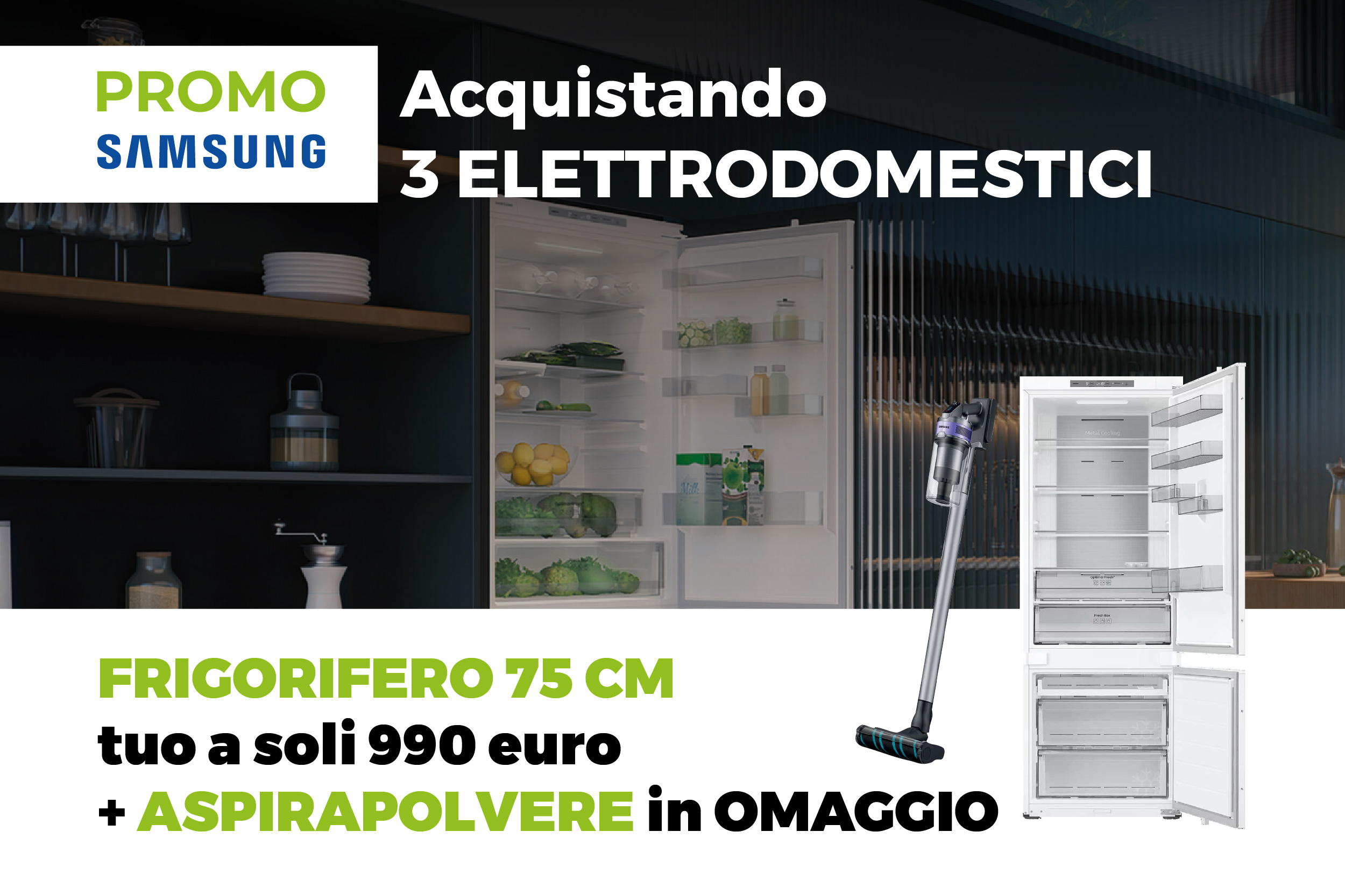 Con una cucina completa di 3 elettrodomestici SAMSUNG (piano cottura, forno, lavastoviglie e microonde h. 45 cm), potrai acquistare il Frigorifero Total No Frost da 75 cm (modello BRB38G703EWW) al prezzo speciale di € 990 IVA inclusa e riceverai in OMAGGIO la Lavastoviglie Mod. DW60M6070IB.