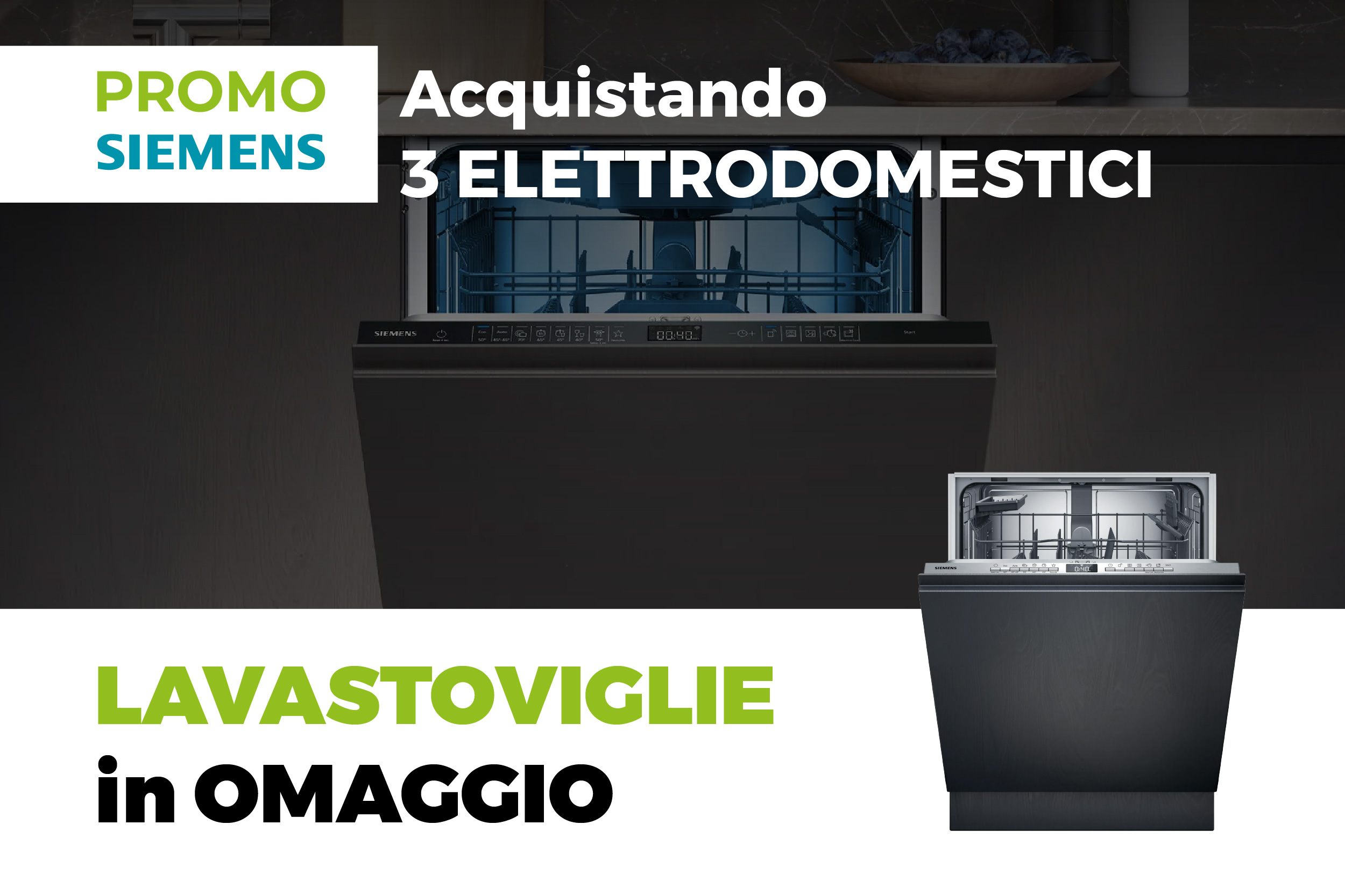 Acquistando una cucina completa di 3 elettrodomestici SIEMENS (a scelta tra piano cottura, forno, frigorifero e microonde*) riceverai in OMAGGIO la Lavastoviglie Mod. SN73HX16TE.