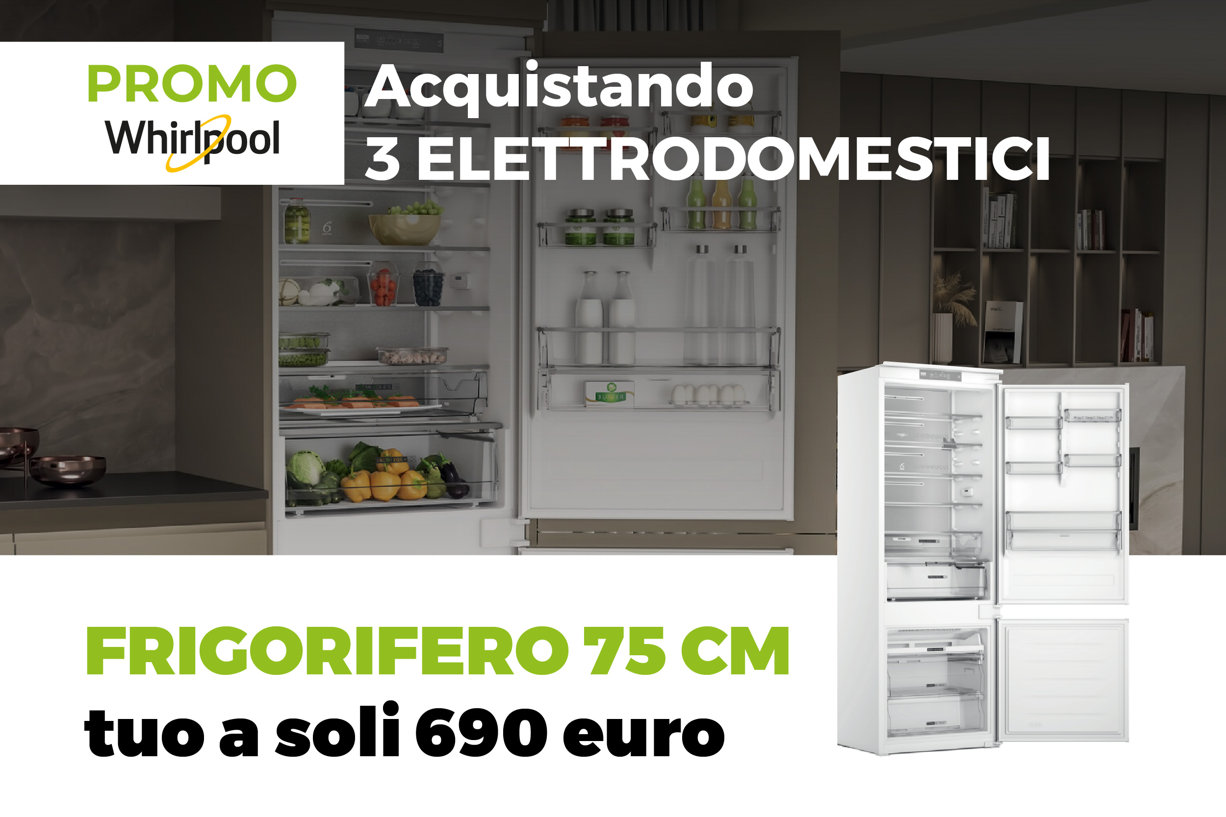 Acquistando una cucina completa di 3 elettrodomestici WHIRLPOOL (a scelta tra piano cottura, forno, lavastoviglie e microonde) potrai acquistare il frigorifero Total No Frost da 75 cm al Prezzo speciale di € 690 IVA inclusa.