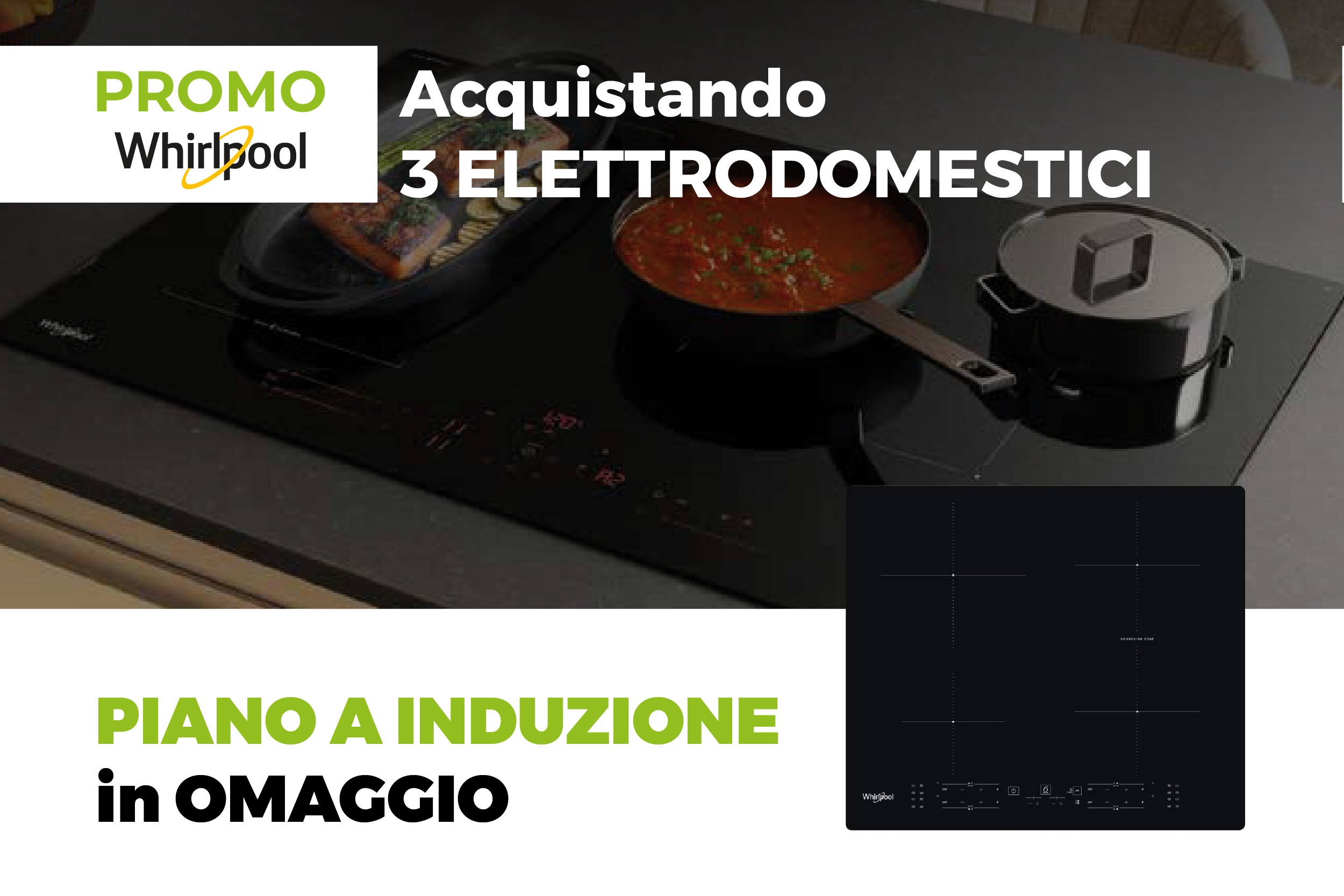 Acquistando una cucina completa di 3 elettrodomestici WHIRLPOOL (a scelta tra forno, frigorifero, lavastoviglie e microonde) riceverai in OMAGGIO il Piano a induzione (cod. WBB8360NE).