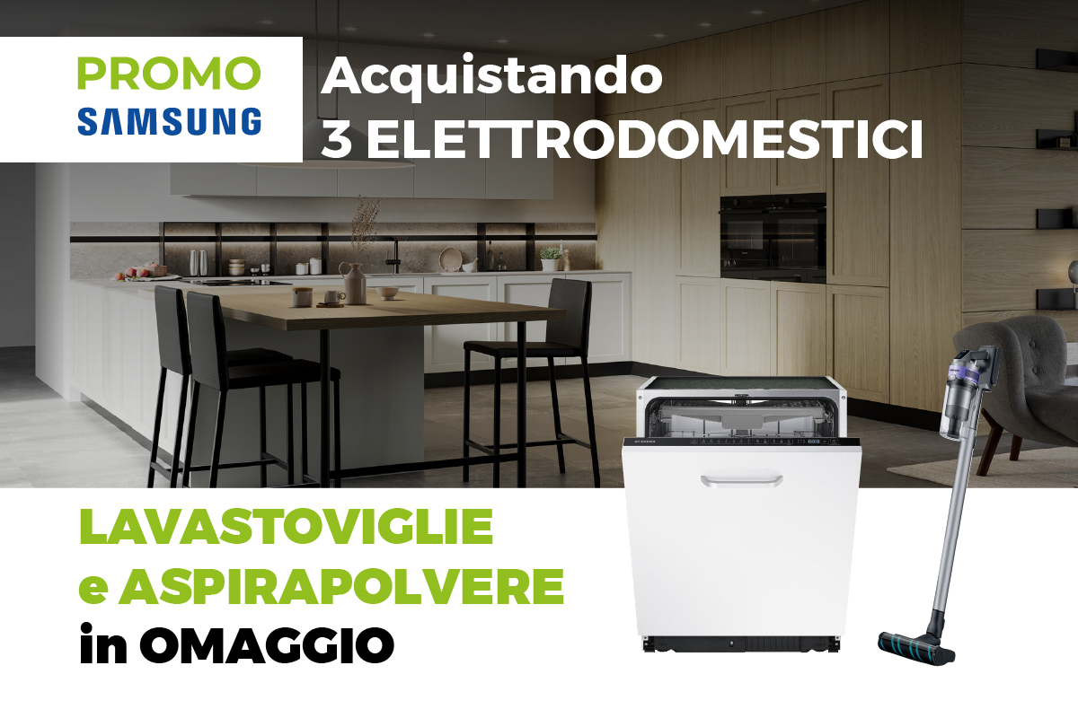 Con una cucina completa di 4 elettrodomestici SAMSUNG (a scelta tra piano cottura, forno, frigorifero, lavastoviglie e microonde h. 45 cm) riceverai in OMAGGIO la lavastoglie (cod. DW60M6070IB) e l’aspirapolvere senza filo (cod. A3 3704).