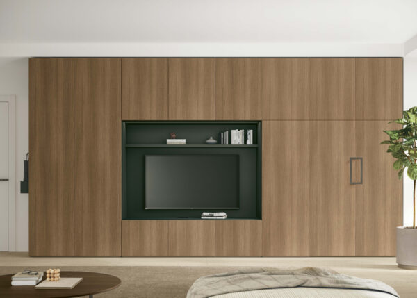 Visto frontalmente l’armadio si lascia apprezzare per l’elegante maniglia di design applicata sull’anta, ma il vero asso nella manica si rivela lateralmente, grazie al vano a giorno con specchiera e cassetto che crea una pratica postazione per vestirsi in camera da letto.