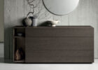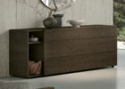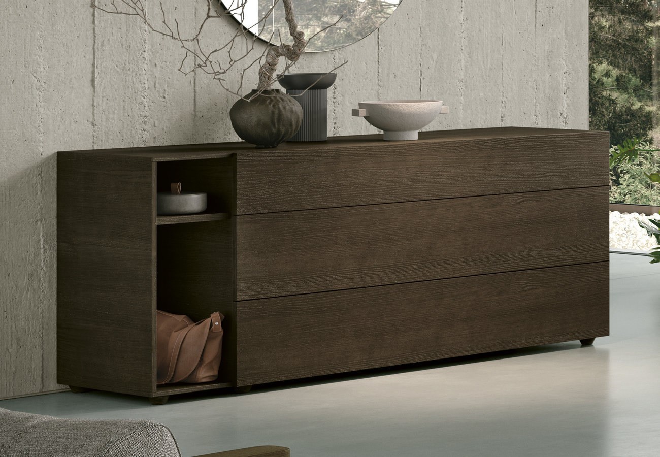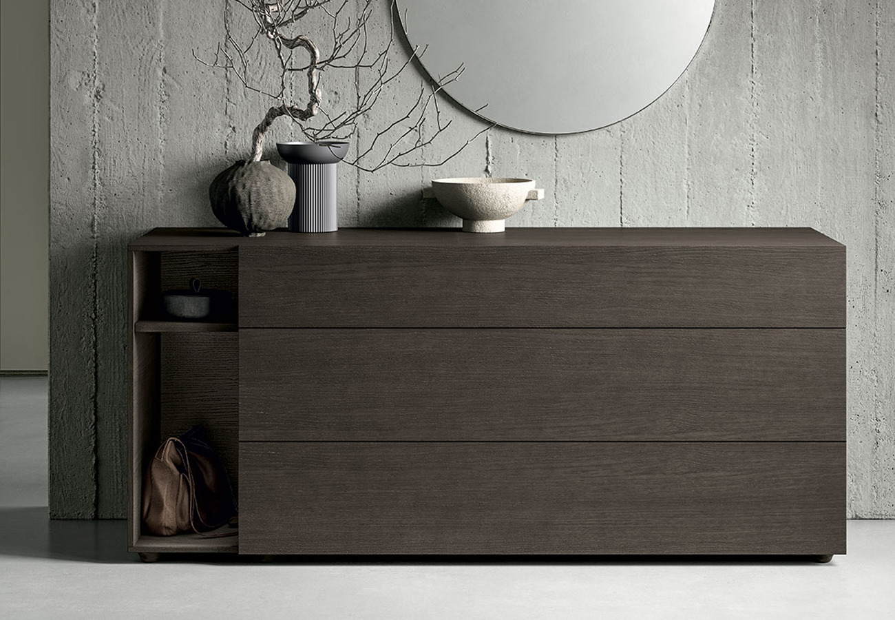 Il gruppo di mobili per la zona notte Theo, firmato Tomasella, apre il suo design lineare ad altre forme di contenimento: il vano a giorno diventa un porta riviste nel comodino, un porta oggetti nel comò e una libreria nei