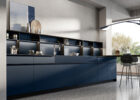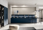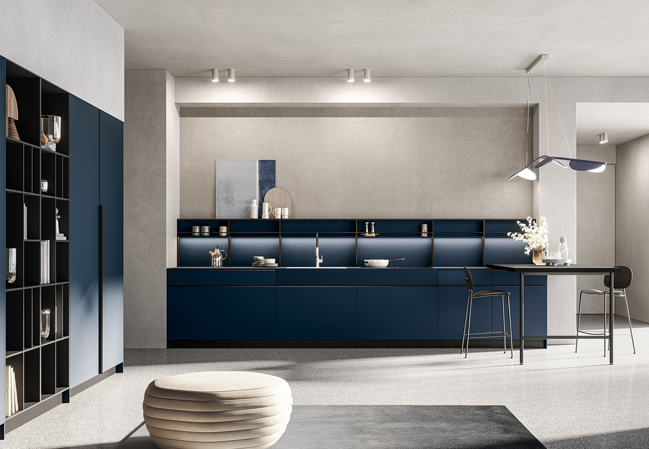 Una composizione dalla forte impronta femminile, nel calore del tono di blu scelto per basi e colonne, realizzate in PET riciclato Islanda. e molto moderna nella scelta di sostituire i pensili con gli schienali attrezzati Sintesi e di prediligere le colonne, alleggerite dai vani a giorno. Queste sono suddivise su due blocchi, l’uno con meccanismo Pocket, che fa scomparire le ante nei fianchi, l’altro con ante in vetro trasparente Teca e schienale in impiallacciato lava.
