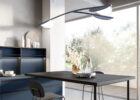 Posizionati sul piano. ali schienali Sintesi con tondini anti ribaltamento e luci Kvoto incassate sotto i ripiani. riprendono il PET riciclato Islanda delle basi. abbinato a fianchi in alluminio nero. Il vicino piano snack, in laminato speciale Fenix nero Ingo è collocato a sbalzo in appoggio sul supporto Tuttotondo, anch’esso in alluminio nero.