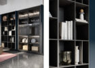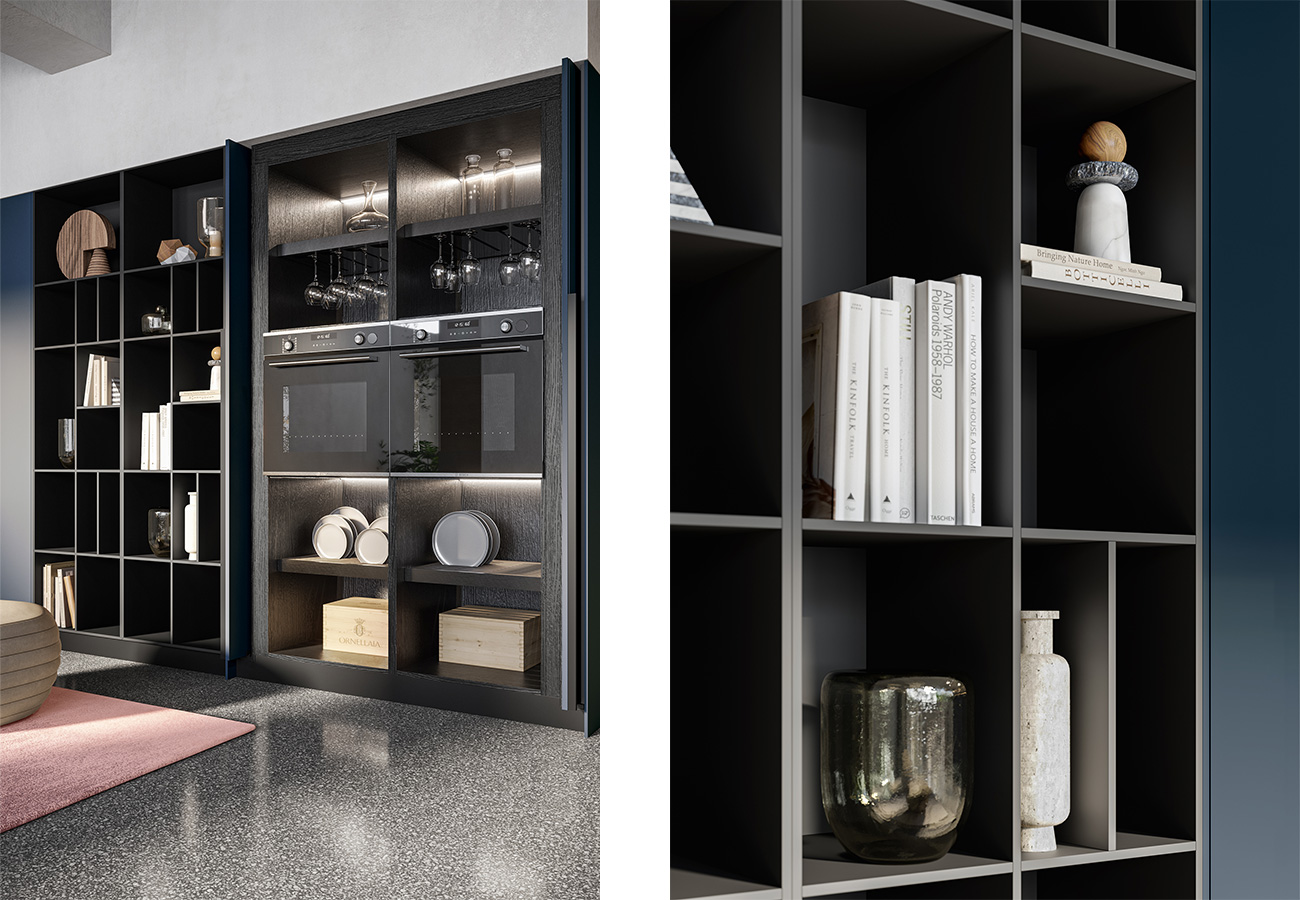 Insospettabile da chiuso, il mecanismo Pocket fa rientrare le ante nei fianchi delle colonne dove può racchiudere gli allestimenti più diversi. In questa composizione, ad esempio, contiene i forni Bosch a vapore all’altezza più comoda per il loro uso. i ripiani Frame con porta calici e piatti e le luci Linear Smart.