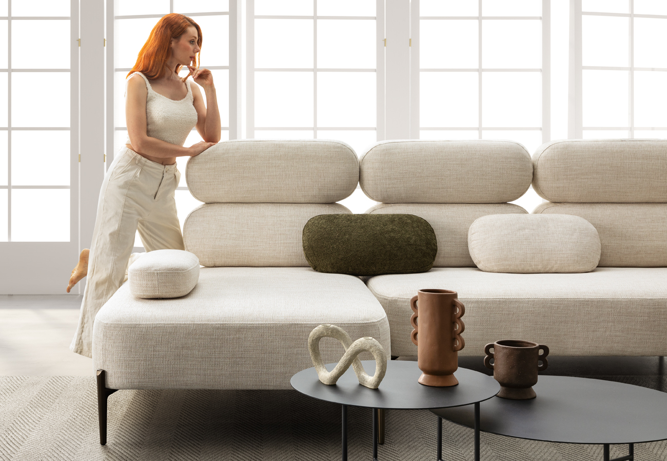 Il divano Avalon si distingue per gli schienali traslanti che permettono di ampliare o ridurre la profondità della seduta con un semplice gesto, passando da una posizione perfetta per il relax disteso a una più raccolta e conviviale.