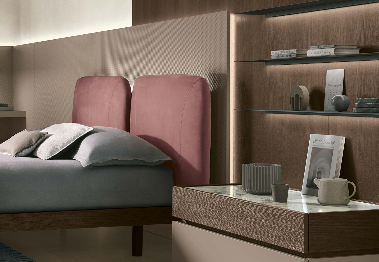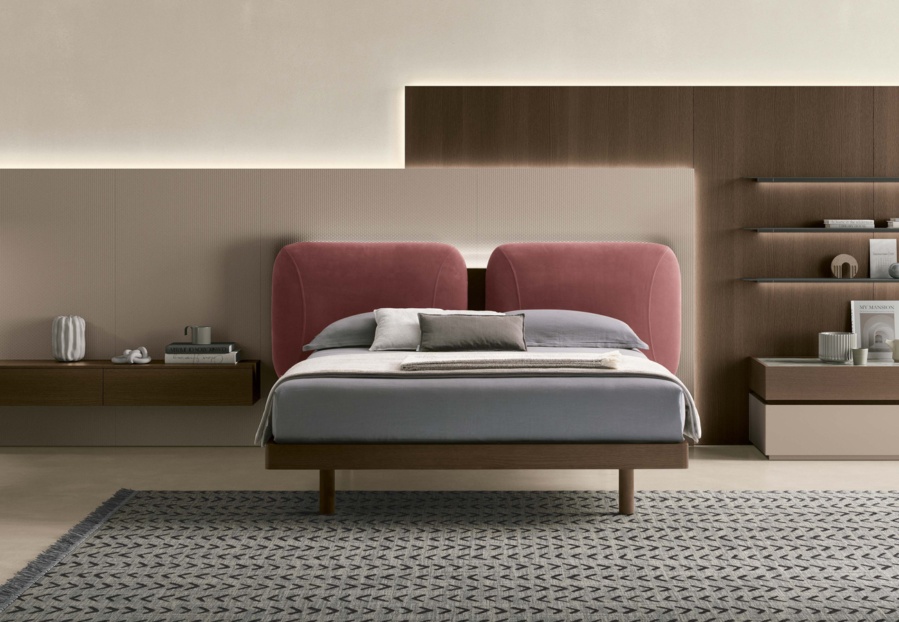 Il letto Elliot di Tomasella coniuga design contemporaneo e comfort per una zona notte dallo stile ricercato. La testiera è caratterizzata da due ampi pannelli imbottiti con angoli arrotondati, inseriti nella struttura principale, creando un piacevole contrasto tra superfici morbide e materiche. Questo dettaglio visivo aggiunge calore e carattere all’ambiente.
