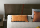 Il letto Ken di Tomasella si distingue per un design moderno e decorativo: la testiera, divisa in due sezioni con finiture materiche diverse, è sottolineata da una fettuccia in tessuto che funge da elemento decorativo, simile a un raffinato patchwork. Il giroletto è caratterizzato da angoli arrotondati, che eliminano spigoli netti e conferiscono morbidezza alla struttura.