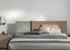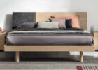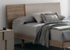 Letto matrimoniale dal carattere contemporaneo con testiera in patchwork tessile e linee morbide.