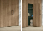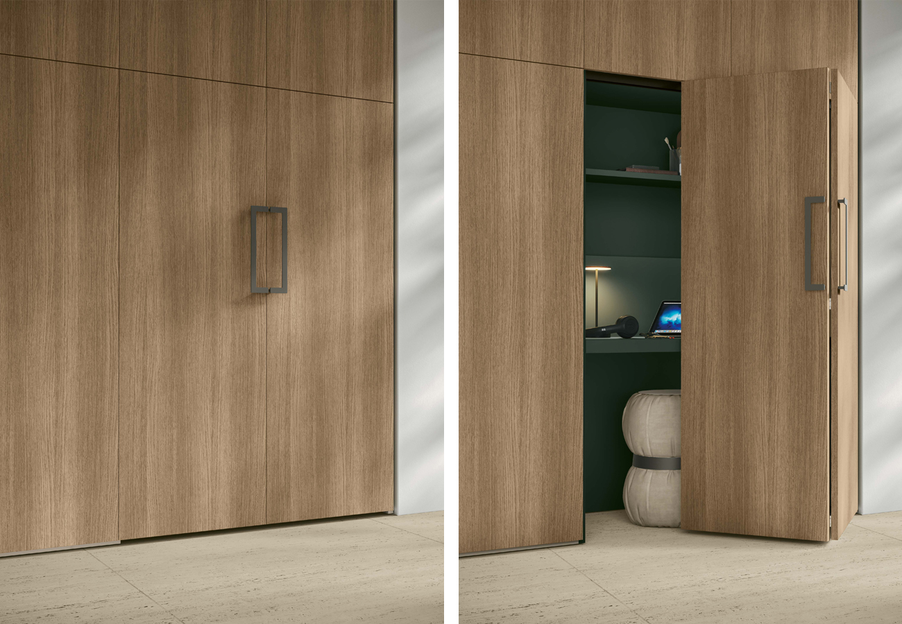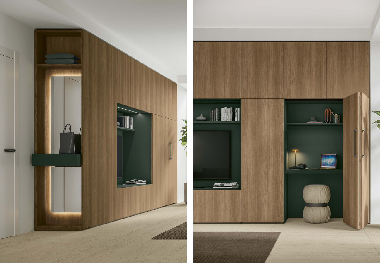 Perfetto anche per zone ingresso, dal momento che il fianco dell’armadio è visibile dalla porta d’ingresso, è stato realizzato come elemento a giornoche definisce l’ingresso con una specchiera e un cassetto sospeso.